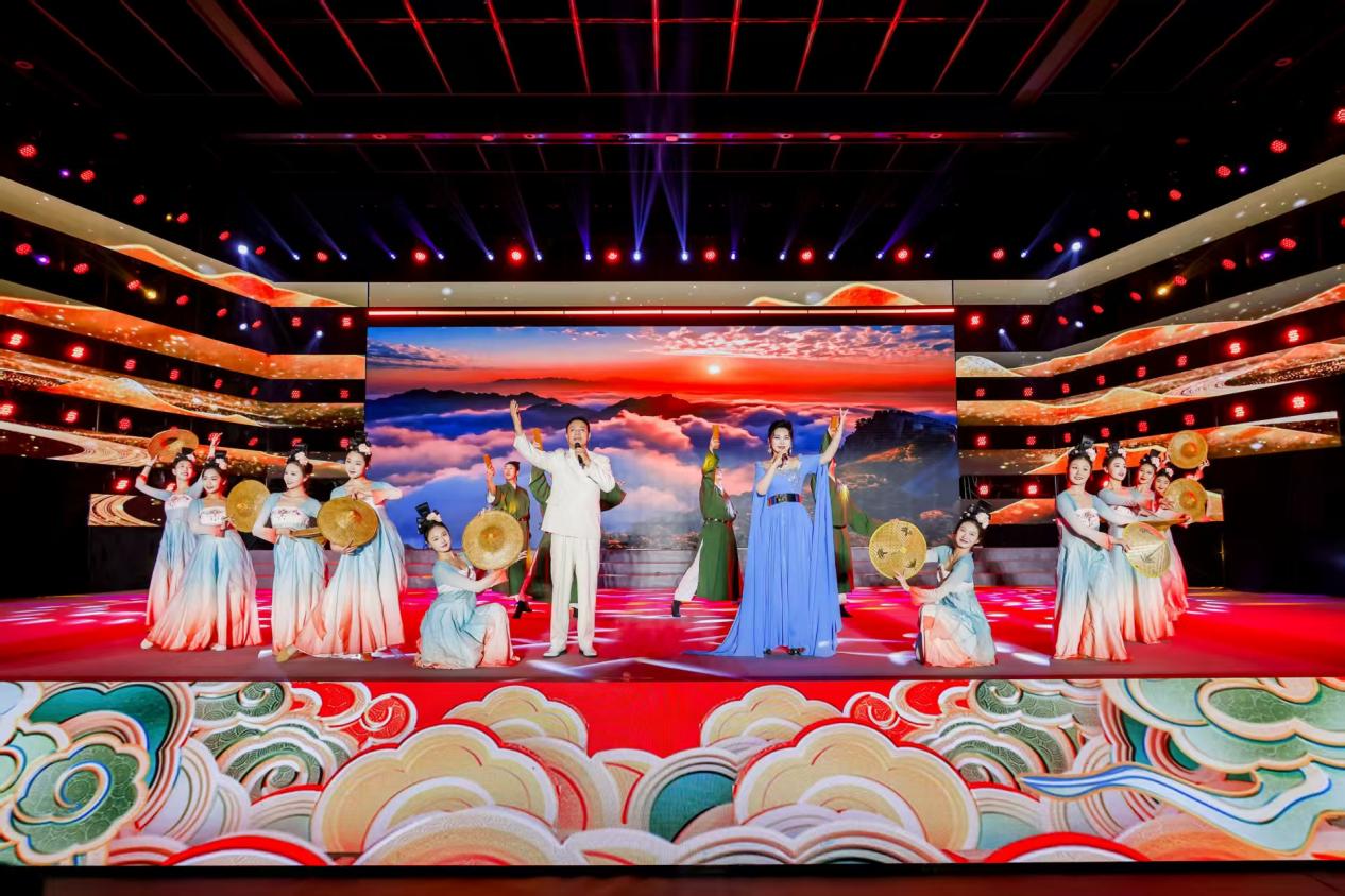 第三篇 章“精诚天下”彰显中医药开放包容、走向世界的博大胸怀,聚焦“一带一路”传统医药国际交流合作,特邀中俄资源合作分论坛常邀顾问林安东、北京师范大学一带一路学院埃塞俄比亚代表墨哲乔、尼泊尔代表濮薇雅、中亚银行代表陈建成先生等沿线国家代表同台共话中医药国际化发展。歌舞《连翘花》由张华敏演唱、东方尚美舞蹈团伴舞,唱响中医药产业助力乡村振兴、带动群众增收的丰硕成果;儿童歌舞《小郎中》由李易慕安领唱、赫舞国际艺术教育助演,展现中医文化进校园的喜人成效;相声《送你一支歌》由陈寒柏、刘际表演,以轻松诙谐的形式普及中医情志养生知识;金种子吟唱团演绎杜甫诗作《曲江二首》,串联古今健康理念、传承中华优秀传统文化;《月宫健康课——嫦娥仙子话周期》由山东中医药大学附属医院韩乐天、吴海萃、王婷婷、王晓琪、任金忻、孙毅鸣、于雅琪表演,以创新形式科普中医健康知识;《敬酒歌》由苗岭笙声艺术团表演,传递跨界交流的真挚情谊;魔术《中医炫彩》由孔繁革、陈兰表演,李雪晴助演,以奇幻形式展现中医文化魅力;《台湾当归》由鹏鸣、兰旗儿演唱,寄托家国情怀与文化认同。特别值得关注的是,晚会现场重磅展示书画家何江思创作的135米《黄帝内经》图文长卷,该长卷由美群健康产业集团有限公司、唐山鸿卓医疗健康科技有限公司联合展示,15.3万字全景呈现中医经典的博大精深。
